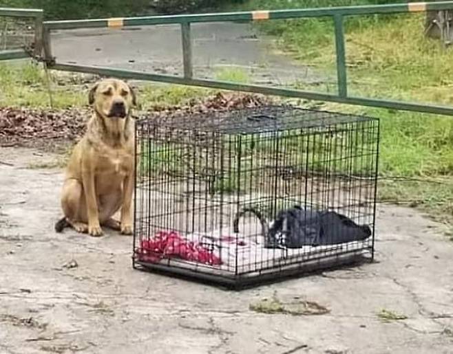 철창 케이지에 자신이 쓰던 물건들이 담겨진 채로 도로에 버려진 유기견이 있습니다. 유기견은 고속도로 인근 도로 한켠에서 철창 케이지 곁을 지켰는데요.