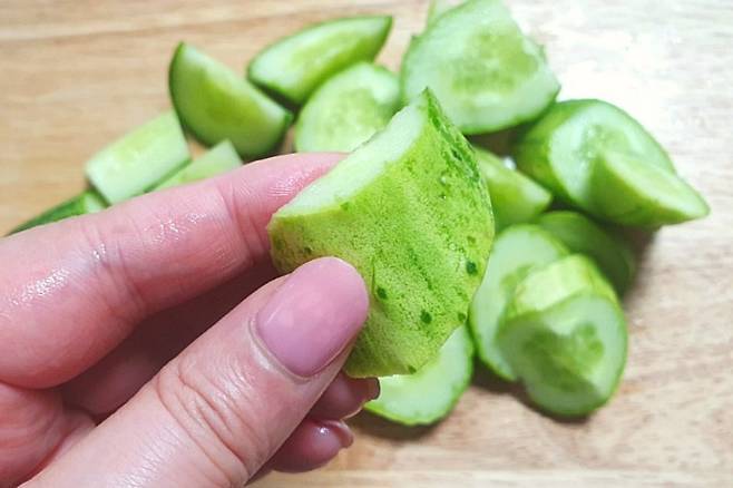 오이를 어슷어슷 투박하게 돌려가며 썰어주세요. 이렇게 썰어주면 오이식감이 더 살아나더라고요.