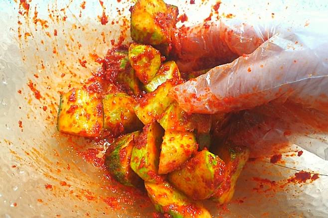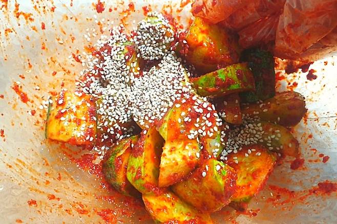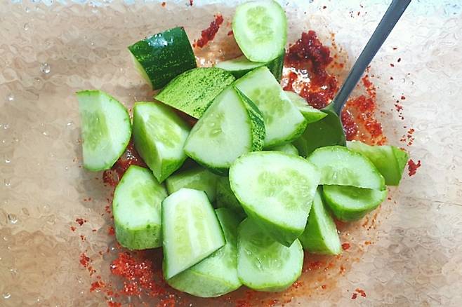 투박하게 썬 오이를 넣어주세요.