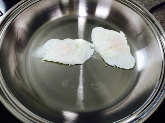 팬을 예열한 후에는 식용유를 소량 두르고, 재빨리 팬을 회전시켜 기름이 얇게 코팅되도록 해줍니다. 기름의 발연점은 200~210도 정도, 팬의 온도는 이보다 약간 높은 상태를 유지해야 합니다. 그 다음 계란을 넣으면, 놀랍게도 코팅팬 없이도 계란이 들러붙지 않고 매끄럽게 구워집니다.