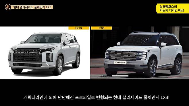 신형 팰리세이드 풀체인지 LX3의 렌더링 이미지가 뉴욕맘모스의 의해 공개되며 디자인 변화에 관심이 모아지고 있다.