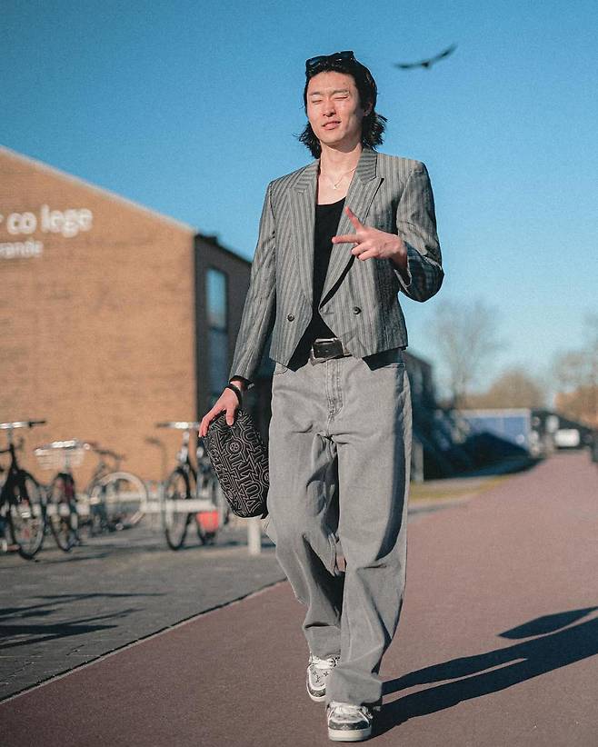 공개된 사진 속 조규성은 스트라이프 패턴이 들어간 짧은 블레이저와 와이드 핏의 데님 팬츠를 매치했다. 블레이저의 구조적인 실루엣과 루즈한 데님이 어우러지며 클래식하면서도 트렌디한 감성이 살아났다. 여기에 블랙 컬러의 슬리브리스 톱을 레이어드해 군더더기 없는 미니멀한 룩을 완성했다.