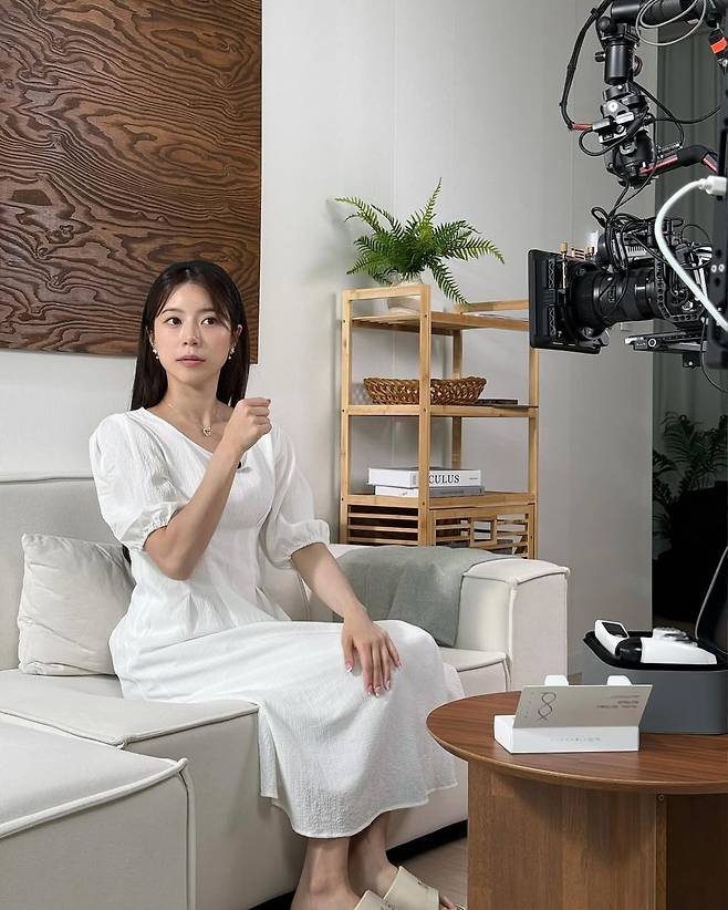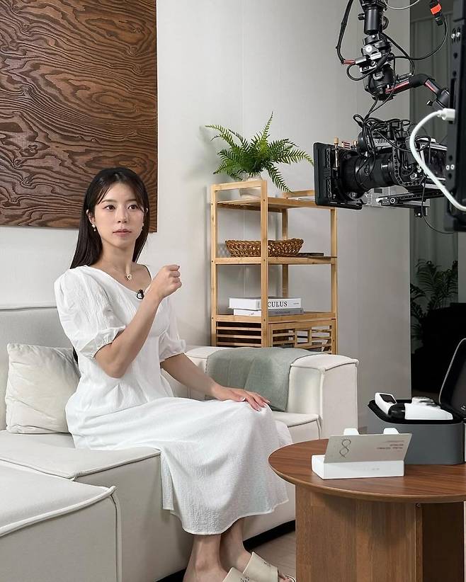 소파에 앉은 채 자연스럽게 포즈를 취한 양지은의 모습은 마치 라이프스타일 화보 한 장면을 연상케 한다. 배경에는 우드 소재 선반과 초록 식물이 배치되어 있어, 그녀의 착장과 조화롭게 어우러지는 미니멀 감성을 전달한다. 액세서리는 심플한 실버 네크리스 하나로 마무리해 스타일의 균형을 잡았다.