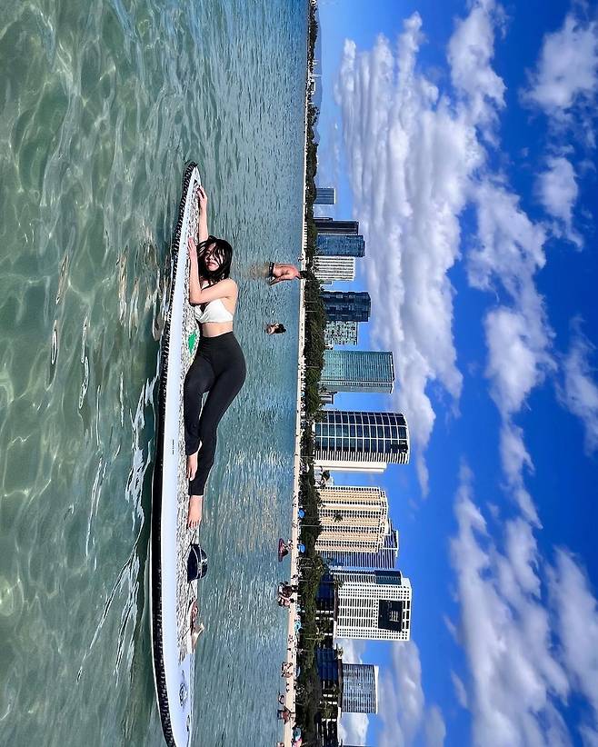 고민시는 흰 브라탑과 블랙 레깅스, 로즈빛 니트 비키니를 입고 하와이의 바다를 즐겼다.