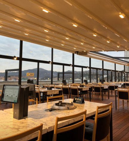 ▶ A존은 통창이 크게 난 루프탑 고기집 공간으로, 도심 뷰를 바라보며 편하게 식사하기 좋습니다.