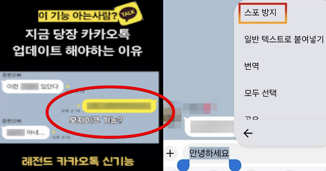 카카오는 지난 20일, 자사 메신저인 카카오톡 앱 업데이트(v25.5.0 이상)를 통해 신규 기능인 ‘스포 방지’를 공식 도입했다고 밝혔습니다. 이 기능은 텍스트 메시지를 보낼 때 특정 부분을 모자이크 처리해, 상대방이 말풍선을 눌러야만 내용이 보이도록 설정할 수 있습니다.