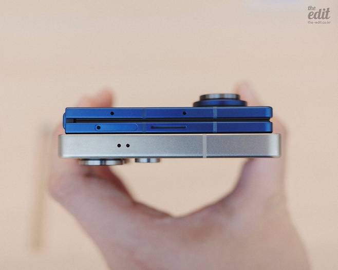 실제로 폴드7을 처음 들어보면 얇은 두께와 가벼운 무게가 곧바로 체감됩니다. 제가 갤럭시 S25 엣지(https://the-edit.co.kr/77418)의 경우에는 단순히 얇은 것이 소비자들에게 큰 공감을 이끌진 못할 거 같다고 했지만, 접은 상태로 휴대해야 하는 폴더블에서는 확실히 얇은 것이 많은 도움이 됩니다. S25 울트라와 비교해 봐도 접은 상태에서의 두께는 거의 차이가 없었어요. 거기에 바형 스마트폰 수준으로 무게를 줄였다는 것 역시 부담감을 많이 줄여 줍니다. 이렇게 두께와 무게를 덜어냈지만, 배터리 용량을 전작인 폴드6과 같은 4,400mAh로 맞춘 것도 다행으로 여겨지네요. 다만 얇아지는 과정에서 정전식 스타일러스를 감지하는 디지타이저가 제거되어 S펜 기능이 삭제된 점을 아쉬워할 분들도 분명 있을 것 같습니다.