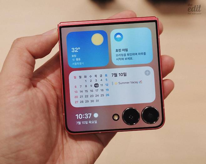 갤럭시 Z 플립7(이하 ‘플립7’)을 딱 들어보면 커버 전체가 켜집니다. 커버 화면을 4.1인치까지 늘이면서 카메라 홀을 제외한 전면 영역 전체가 디스플레이가 되었거든요. 베젤 두께도 고작 1.25mm입니다. 화면이 커지면서 플립 계열의 단점인 닫은 상태로 할 수 있는 것이 많지 않다는 게 상쇄되는 느낌이었어요. 내부 화면 역시 6.7인치에서 6.9인치로 커졌고, 배터리도 4,300mAh로 늘렸어요. 카메라 사양은 플립6과 동일합니다.