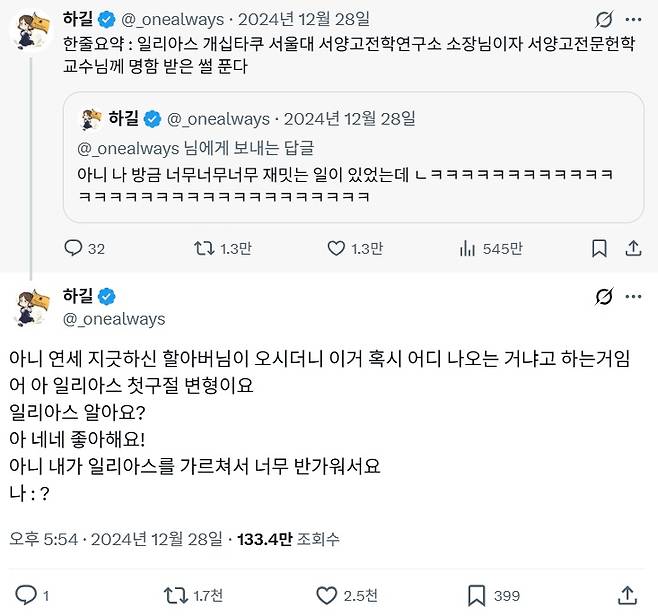 | ▲ 석민주씨는 2024년 12월 28일 탄핵 집회 현장에서 <일리아스> 깃발을 알아본 안재원 교수를 만났고 이 이야기를 엑스(X, 옛 트위터)를 통해 생중계했다. 해당 게시글은 리트윗 수가 1만 3000회를 넘어갈 정도로 큰 화제가 됐다. |
