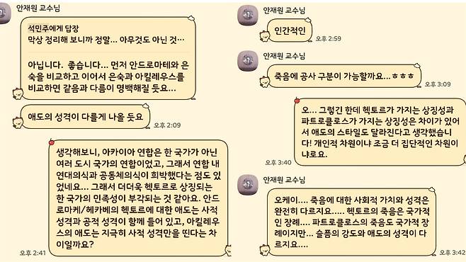 | ▲ 석민주씨와 안재원 서울대 인문학연구원 서양고전문헌학과 교수가 <일리아스>의 해석에 관한 의견을 주고받았던 카카오톡 대화. |