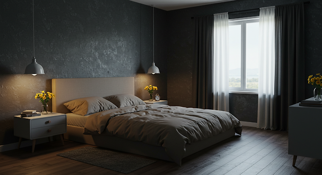 물론 분위기에는 도움이 될 수 있지만, 풍수에서는 빛과 색의 조화가 기운의 흐름에 직접적으로 영향을 미친다고 보기 때문에, 지나치게 어둡고 닫힌 분위기의 침실은 양기의 흐름을 차단하고 재운까지 막을 수 있습니다.