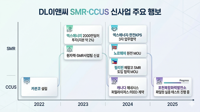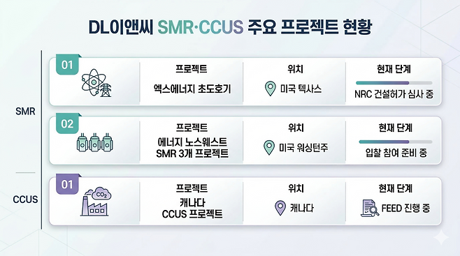SMR·CCUS는 초기 투자부터 상용화까지 수년이 소요되는 구조적 특성상 단기 수익 인식보다 기반 구축이 우선되는 사업이다. DL이앤씨 관계자는 "SMR, CCUS 등은 기술 검증 및 글로벌 파트너 협력, 해외 프로젝트 검토 등을 통해 사업 기회를 단계적으로 모색하고 있다"고 밝혔다.