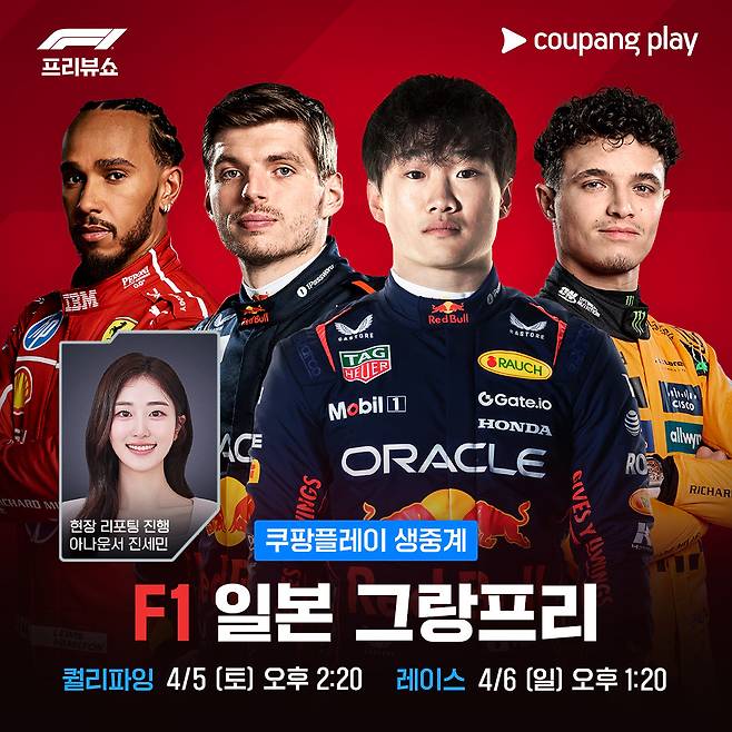 쿠팡플레이가 4일(금)부터 2025 FIA 포뮬러 원 월드 챔피언십(이하 ‘F1’) 일본 그랑프리를 올 시즌 첫 현장 리포팅과 함께 ‘풀 패키지’ 중계로 선보인다.