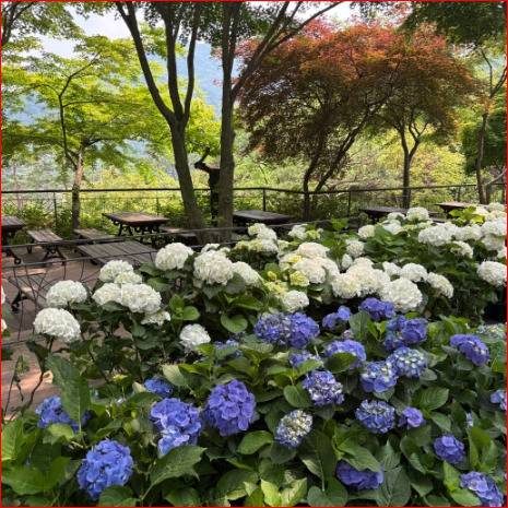 시원하게 떨어지는 폭포 소리와 함께 수국이 어우러지는 풍경은 사진 명소로도 유명합니다.특히 여름 햇살 아래 수국빛이 반짝일 때나 흐린 날의 푸르름 속에서도 각기 다른 매력을 뽐내 인생샷을 남기기에 안성맞춤입니다.연인, 가족, 친구와 함께하면 더할 나위 없는 힐링 여행지가 되어줍니다.