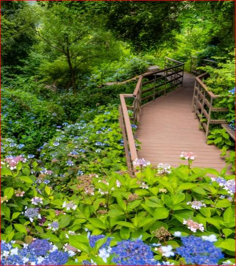 초여름, 수국이 물결치는 숲 속 정원