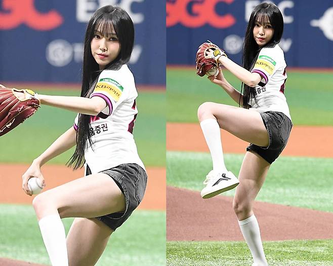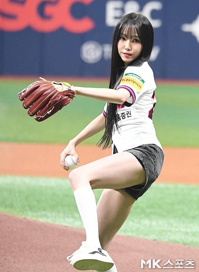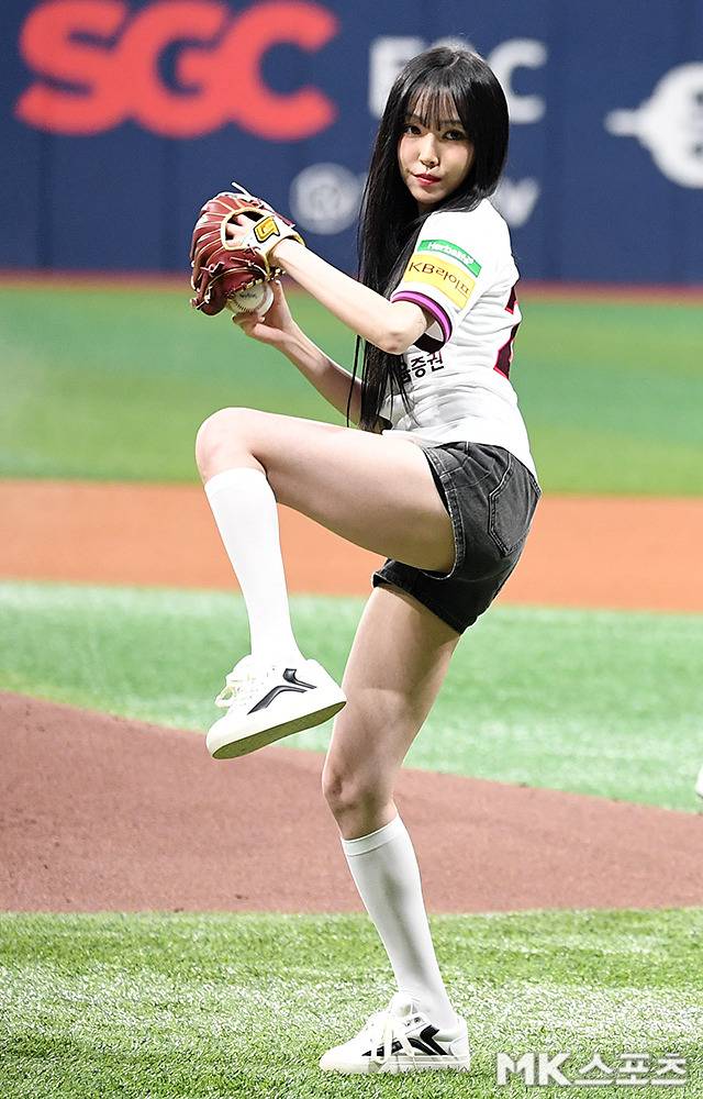 자연스럽게 흐르는 스트레이트 롱 헤어와 강렬한 눈빛은 마운드를 압도했고, 시구 동작에서도 완벽한 자세를 뽐내며 프로 못지않은 포스를 드러냈습니다.