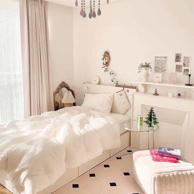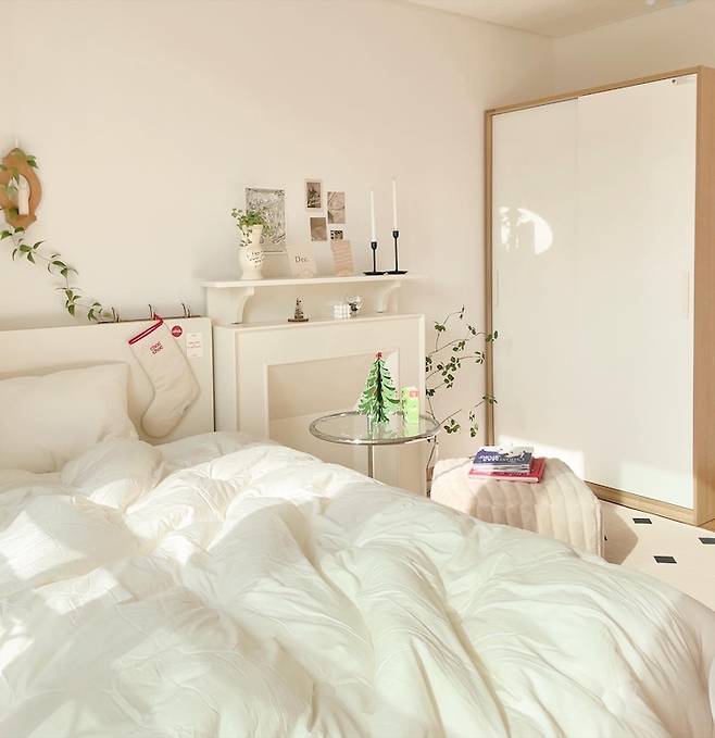 헤드가 없는 침대를 써볼까 하다가 조금 불편할 것 같아 아주 슬림한 헤드 디자인의 침대를 들였어요. 헤드 위로 충전, 수납, 조명 기능이 모두 다 있어 만족스러워요. 벽난로와 테이블을 넣고 폭신한 재질의 침구까지 세팅해 주니 마치 원룸 꾸미기 하는 사회 초년생 느낌이 들어 아주 즐겁게 공간을 만들었답니다.