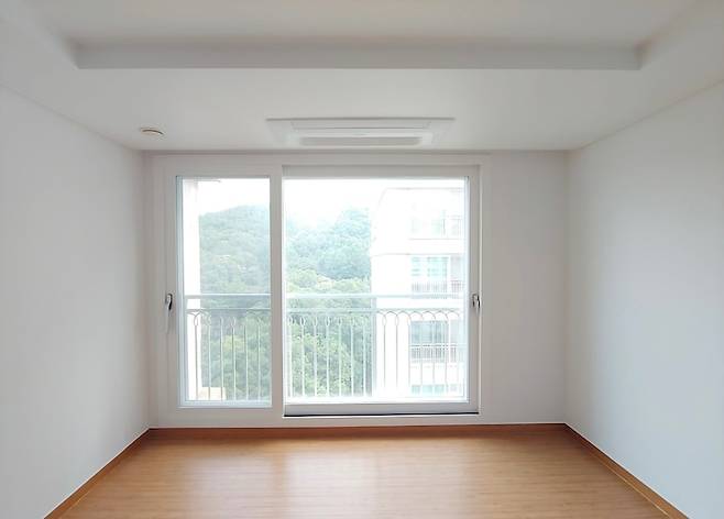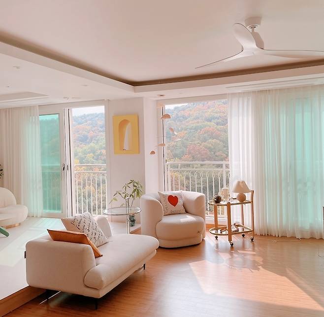 그렇게 확장한 거실의 모습이에요. 창밖으로 하늘과 산이 더 시원하게 보이고 집 전체의 채광도 더 좋아졌답니다. 거실의 개방감이 매우 만족스러워서 '거거익선'을 몸소 깨달았어요. 기존의 원목 마루는 살리고 메인 컬러를 화이트로 선택해서 화이트 & 우드 중심의 인테리어로 방향을 잡았습니다.