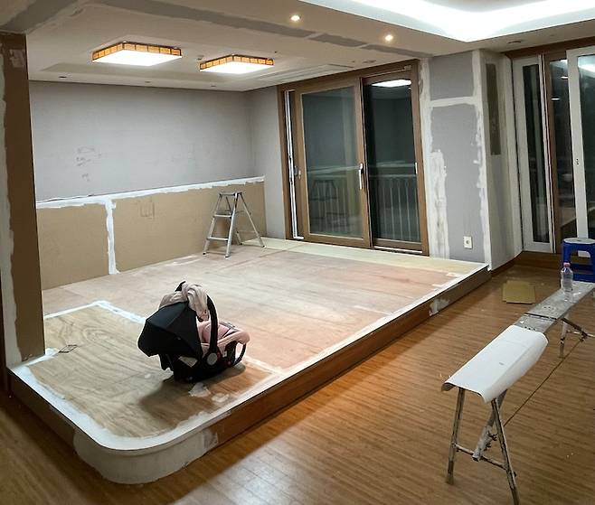 다급한 마음에 100일도 안된 아기를 데리고 현장 출동하여 수습한 결과는'단 올리기'였습니다. 면적이 넓어 벤치형은 어렵겠더라고요. 결정 후에는 목공 작업할 업체 찾기, 바닥 마감을 위한 장판 발주, 기존 마루와 연결감을 줄 필름 찾기 등등 참 바쁜 날들이었어요.