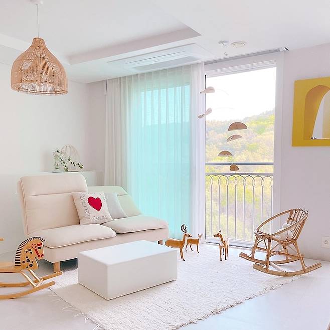 숲 뷰가 예쁜 집에 어울리는 내추럴한 느낌의 라탄 조명과 흔들의자, 우드 목마도 마련했어요. 세 개의 제품 모두 그 자체로도 예쁜 디자인이라 지금까지 만족스럽게 사용하는 아이템입니다.