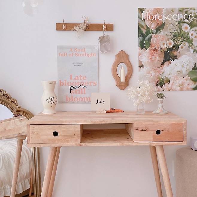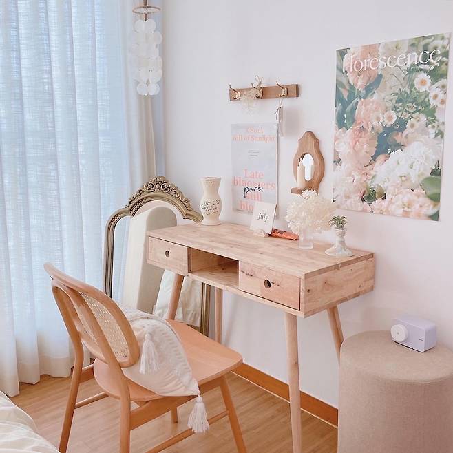 침대 옆 공간은 저만의 작은 화장대 겸 테이블로 꾸며봤어요. 내추럴한 느낌의 원목 가구들과 소품, 포스터들을 조합해서 부드럽고 아늑한 공간을 만들어 보았습니다. 우드 중심에 골드 코트랙, 빈티지 거울, 자개 모빌 등 각기 다른 텍스처의 소품을 함께 배치해서 지루하지 않게 연출했어요.
