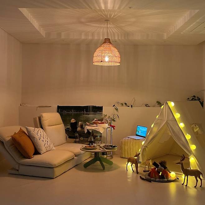아이의 공간도 중요하지만, 거실은 저희 부부의 공간이기도 하니까 육퇴 후에는 이렇게 홈캠핑 느낌으로 연출하기도 해요. 육아템이지만 그럴싸하죠? ㅎㅎ 리클라이너 소파는 다릿발을 아예 빼버릴 수도 있어서 좌식 테이블과 함께 쓰면 한층 안락한 느낌이 살아납니다!
