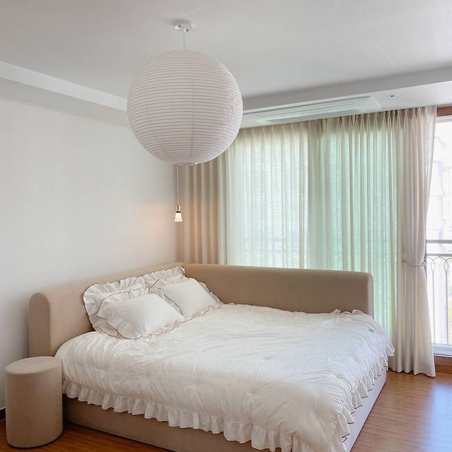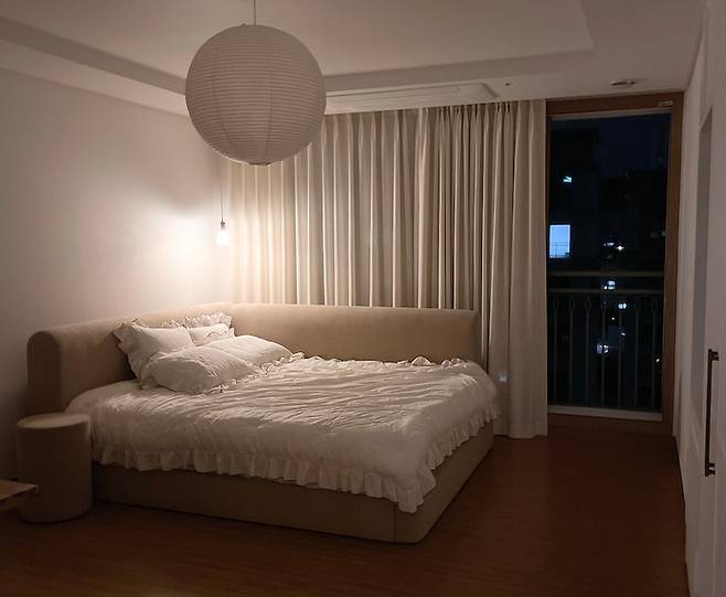 조명을 교체하고 가구까지 배치한 안방의 모습입니다. 따듯한 느낌을 내기 위해 패브릭 침대를 배치하고 크림 컬러의 커튼을 달아줬어요. 집 전체의 분위기와 어울리는 은은한 무드의 펜던트 조명도 달아주었습니다.