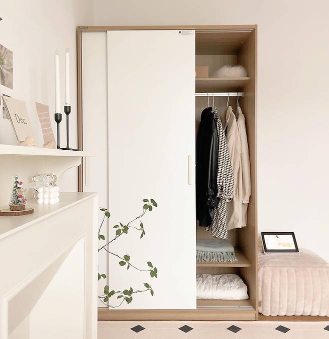 안방만큼 크지 않은 공간이고 붙박이장이 없기에 슬라이딩 형태의 옷장과 수납장을 놓아주었어요. 미닫이 형태라 공간 차지 없이 깔끔하게 수납할 수 있어 실용적입니다.