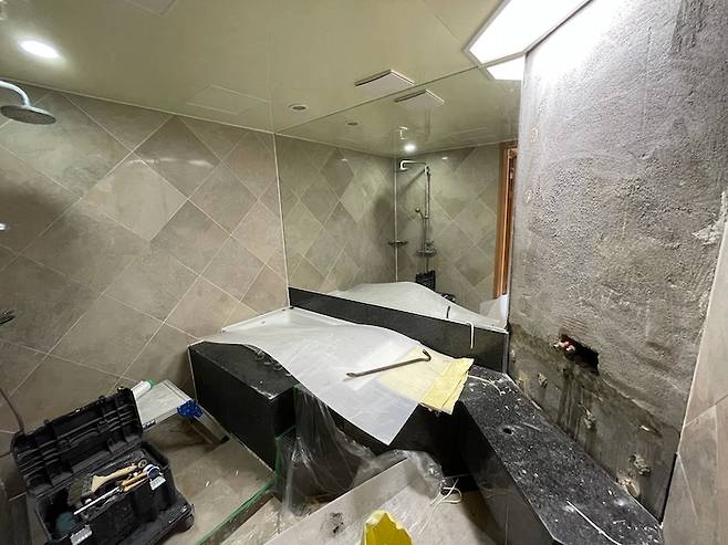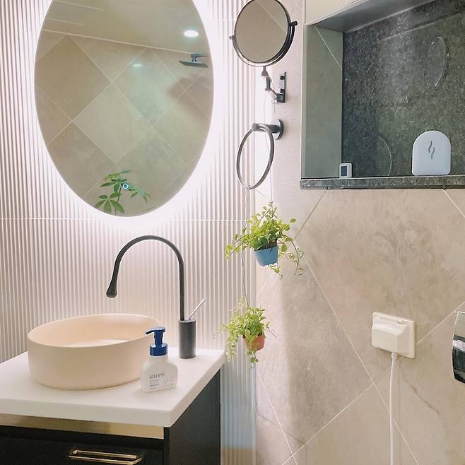 기존에 있던 벽타일이 사이즈도 크고 컬러도 은은하니 나쁘지 않아서 그대로 가져가기로 했습니다. 욕조와 양변기 뒤쪽의 대리석이 모두 블랙이라 나머지 수전과 액세서리도 모두 블랙으로 맞춰줬어요. 세면대 부근 벽에는 템바 타일과 LED 조명으로 포인트를 줬습니다.