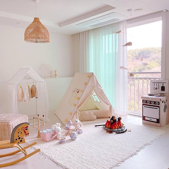 아이가 돌이 되기 전까지는 최대한 안전한 제품들로 공간을 꾸며줬었어요. 패브릭으로 된 장난감과 이동하기 쉬운 텐트, 뜨겁지 않은 코튼 전구 등으로 심플하지만 예쁜 포토존을 만들어 주기도 했습니다.📷