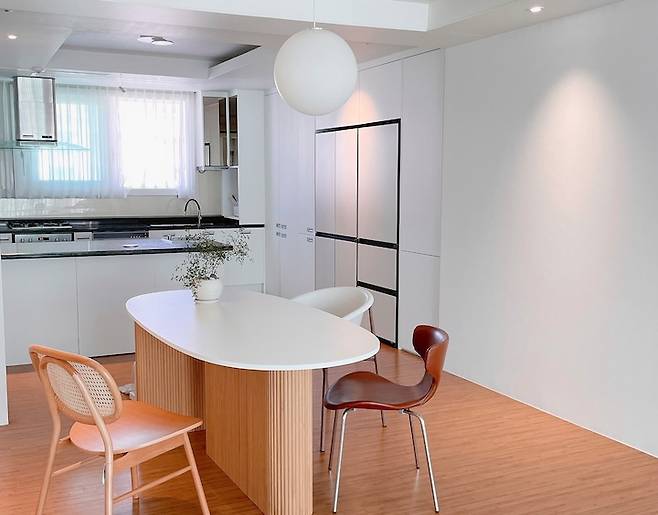바뀐 주방의 모습입니다. 최소한의 시공이지만, 많이 깔끔해진 모습이에요. 거창한 시공도 대세를 따른 타일 한 조각 없는 주방이지만 파티션이나 수납장 등으로 다양한 변화를 시도해 보고 있어요. 싱크대와 아일랜드 쪽은 아무래도 생활을 가장 많이 하는 곳이기에 최대한 '깔끔함'을 목표로 했어요. 키친핏도 오차 없이 수납하고 식탁 위 조명도 심플한 디자인으로 골라주었습니다.