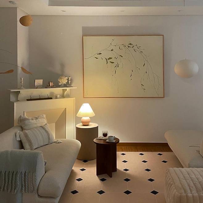 벽난로 인테리어는 꼭 해보고 싶었던 아이템인데 허전한 벽도 채워주고 홈카페 분위기도 연출되어 요긴하게 사용하고 있습니다. 대형 액자는 이사 후 남편에게 받은 생일 선물로 디자인과 사이즈, 프레임까지 고심해서 고른 작품인데 화이트 벽에 너무 튀지 않게 은은한 존재감을 주고자 했어요. :)
