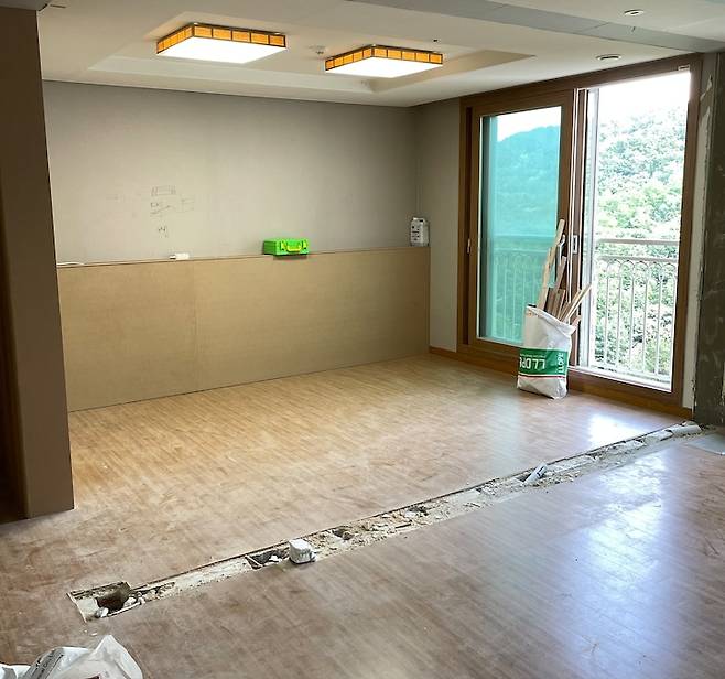 거실 확장으로 방을 없애고 만든 서브 거실을 많은 분들이 궁금해하시더라고요. 위 사진은 보기만 해도 시원한 철거 현장인데요. 시원함도 잠시, 눈앞에 닥친 문제는 빵꾸(?)가 난 바닥이었어요.