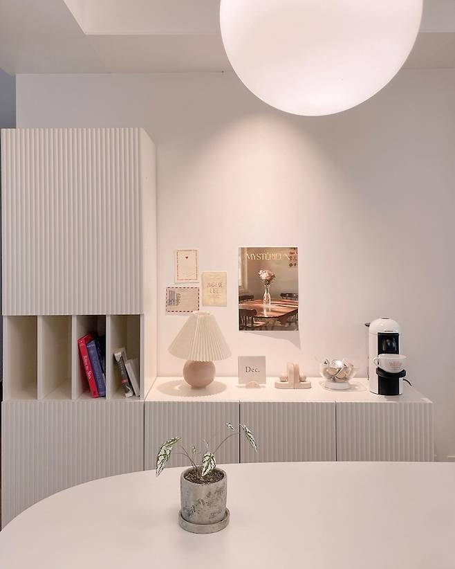 스타일링에 따라 계속 달라지는 주방 벽면의 모습, 눈치채셨나요? :) 주방에 수납할 공간이 많아 수납장이 필요 없다고 생각했는데, 홈카페존은 다른 영역인 것 같아 구성을 바꿔봤어요. 식탁 테이블 근처에 템바 보드 수납장을 두고 소품과 커피 머신을 올려놓으니 새로운 홈카페존이 탄생했답니다.