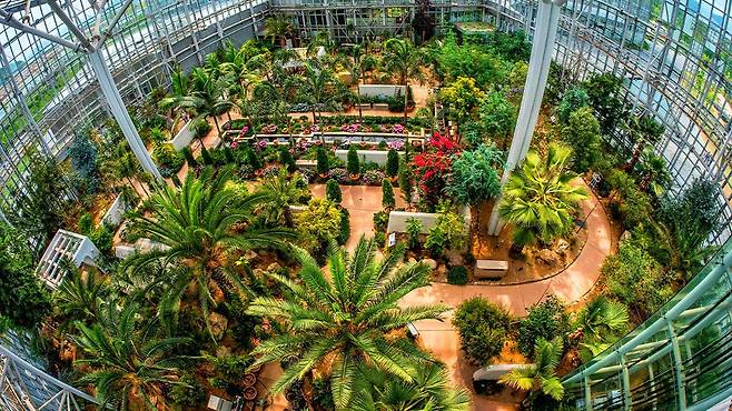 올리브나무와 대추야자, 부겐빌레아가 가득한 지중해 온실에는 32m 높이 전망대가 있어 온실 전체를 한눈에 조망할 수 있습니다.
