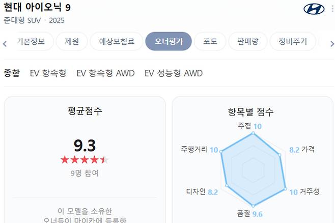 실제 차주들의 평가를 기반으로 차량 만족도 점수를 공개하는 ‘네이버 마이카 오너평가’에 따르면 현대차 아이오닉 9의 평균 점수는 9.3점의 높은 점수를 기록했다.