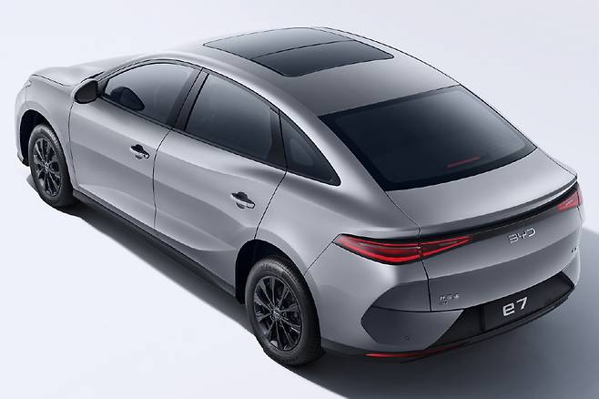 BYD e7은 최신 패밀리룩인 마린 에스테틱을 적용했다. 전면부는 날카로운 인상의 헤드램프와 트라페즈 형태의 공기 흡입구가 조화를 이루며, 차분하면서도 안정감 있는 인상을 전달한다. 후면부는 분리형 테일램프와 간결한 범퍼를 통해 가격 대비 단순하고 절제된 이미지를 보여준다. BYD의 최신 일체형 후미등은 적용되지 않았지만, 전반적으로 무난한 균형감을 유지했다.