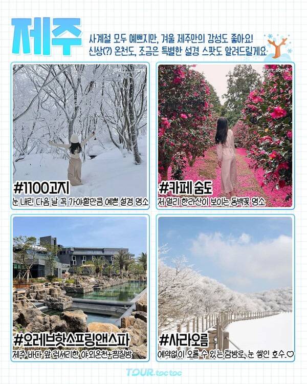 눈 소식이 있다면 달려가야하는 제주도는 1월 설경과 붉은 동백꽃의 조화가 아름다운 국내여행지입니다. 1100고지와 사라오름은 어마어마한 적설량의 제주도에서만 볼 수 있는 특별한 설경을 자랑하는 곳인데요. 겨울철 '한라산 눈꽃버스'로 다녀올 수 있는 1100고지는 쭉 뻗은 도로를 중심으로 눈덮인 나무들이 줄지어 서있어 개운한 풍경이 펼쳐집니다.