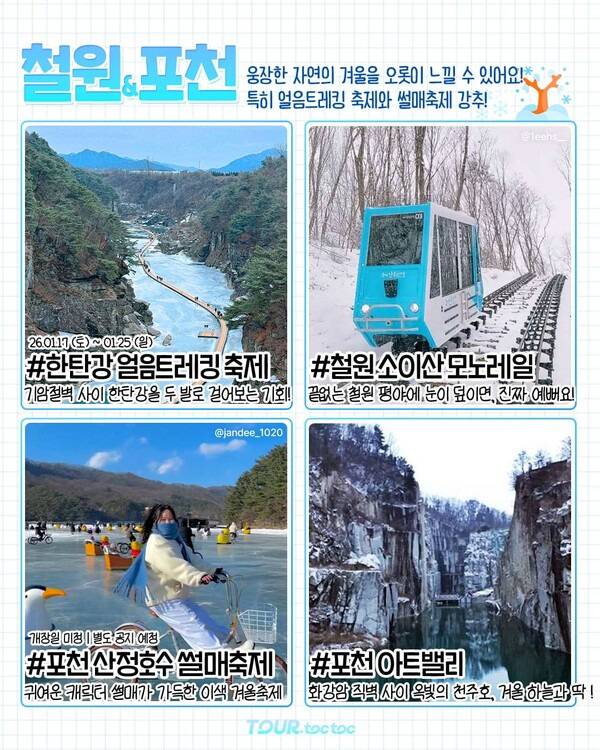 ✅ 철원 한탄강 얼음트레킹 축제 ✅ 철원 소이산 모노레일 ✅ 포천 산정호수 썰매축제 ✅ 포천 아트밸리