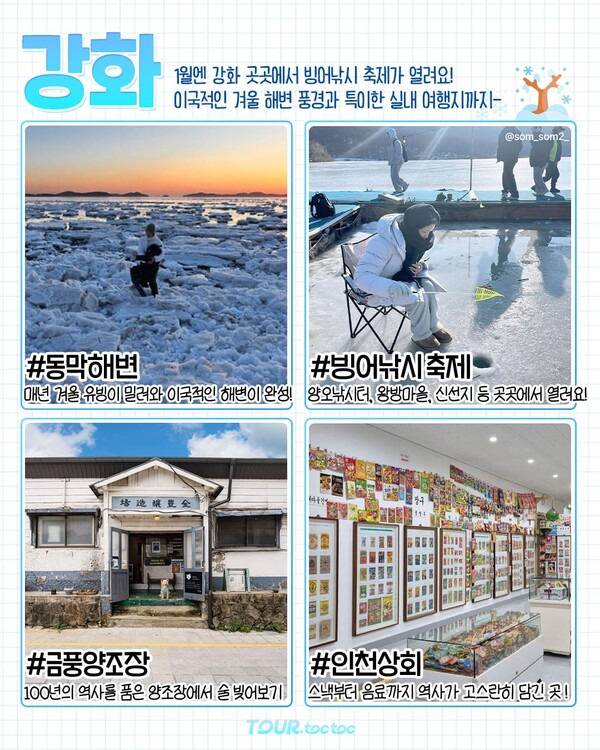 당일치기로도 좋은 1월 국내여행지 강화도는 수도권에서 1시간 30분이면 도착해 접근성이 훌륭합니다. 특히 강화도 동막해변은 '한국의 아이슬란드'라는 별명을 지니고 있는 곳인데요. 매년 1월 경, 해변으로 밀려온 유빙 위에 눈이 쌓이며 이국적이면서 신비로운 겨울 해수욕장의 정취를 느낄 수 있습니다.