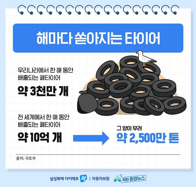 전 세계를 기준으로 한다면 약 10억 개의 폐타이어가 한 해 동안 배출되고 있으며 그 양은 무려 약 2,500만 톤에 달한다고 하네요.