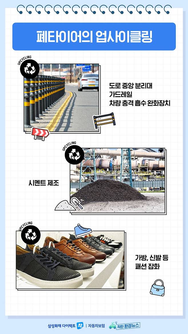 타이어 제조 업계 외에도 폐타이어를 가공해 도로 중앙 분리대나 가드레일, 차량 충격 흡수 완화장치 등을 만들기도 한다는 사실, 알고 계셨나요? 이처럼 폐타이어를 활용해 만든 도로 구조물은 부드럽고 탄성이 좋아 충격을 완화하고 자동차의 급격한 파손을 막아준다고 합니다.