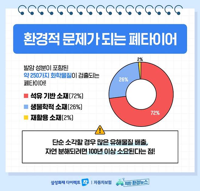 이렇게 배출되는 수많은 폐타이어가 자연 분해되려면 100년 이상 소요된다는 점 알고 계셨나요? 그래서 폐타이어가 환경 오염의 주범으로 지목되고 있다고 합니다. 왜 폐타이어가 환경 오염의 주범으로 지목되는지 이유를 알아볼까요? 일반적으로 타이어는 72%의 석유 기반 소재와 26%의 생물학적 소재, 그리고 2% 재활용 소재로 이루어져 있습니다. 이렇게 다양한 물질을 함유하고 있기 때문에 단순 소각할 경우 많은 유해 물질이 배출된다고 합니다.