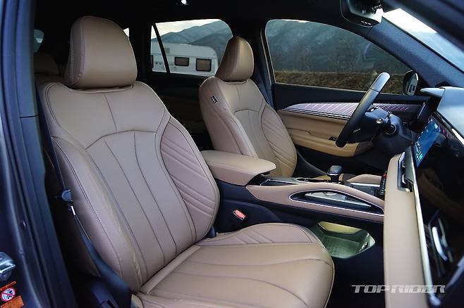 개인적으로 스웨이드 소재를 시트에 사용하는 것을 선호하지 않는데, 그랑 콜레오스는 영리하게 체중이 실리지 않는 디테일 부분에 선택적으로 스웨이드 소재를 사용, 감성적인 부분을 충족시키면서 더워지거나 체중에 눌리는 상황은 피했다. 나파 인조가죽은 촉감이 좋다.