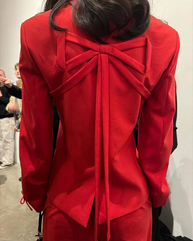 얇은 굵기의 리본, 셋업과 동일한 레드 컬러로 조화를 이뤄