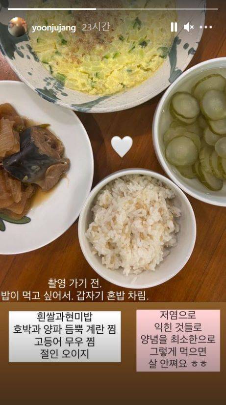 장윤주는 푸짐하게 차려진 한 끼 식단과 함께 '저염으로 익힌 것들로 양념을 최소한으로 이렇게 먹으면 살 안 쪄요'라는 멘트를 남겨 눈길을 끌기도 했습니다.