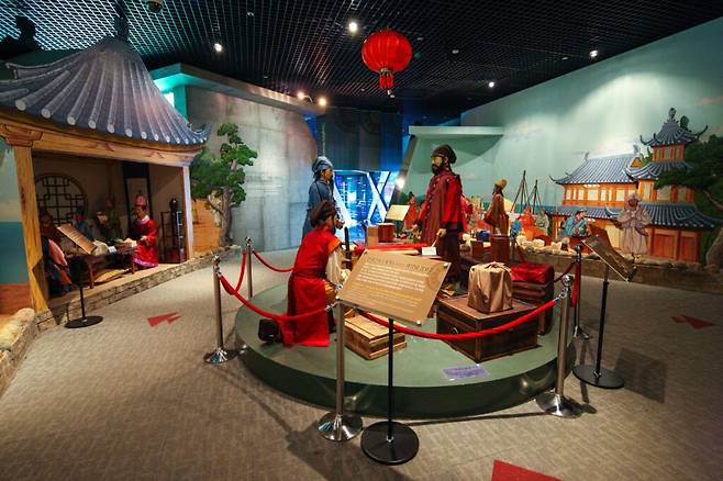 기념관 내부에는 장보고 대사의 해상 활동을 재현한 모형과 당시의 해양 문화를 엿볼 수 있는 유물들이 전시되어 있어요.