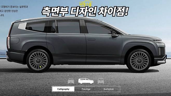 특히 최고급 트림인 캘리그래피가 가장 눈에 띄는 디자인 특징을 가지고 있다. 콤팩트 디지털 사이드 미러와 독특한 마차 휠 디자인이 캘리그래피의 대표적인 특징이다. 이를 통해 더욱 세련되고 고급스러운 느낌을 연출한다.
