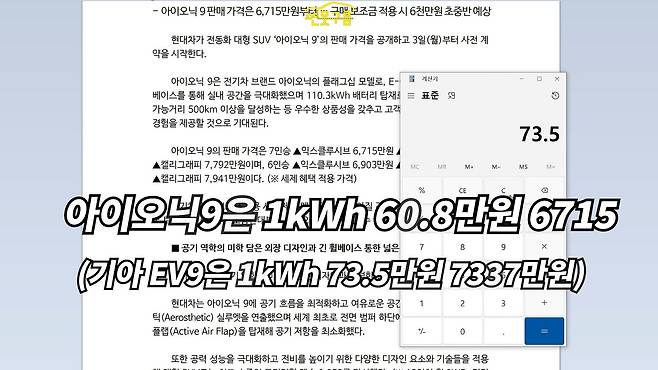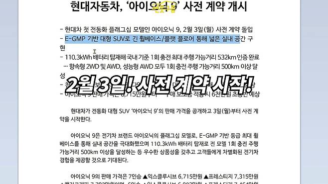 이처럼 아이오닉 9은 세련된 디자인과 편리한 기능으로 새로운 전기차 라이프스타일을 제안할 것으로 기대된다. 특히 경쟁 모델 EV9보다 저렴한 가격은 소비자들에게 매력적인 선택지가 될 것으로 보인다. 해당 유튜브 채널의 이용허락을 받아 제작했습니다.