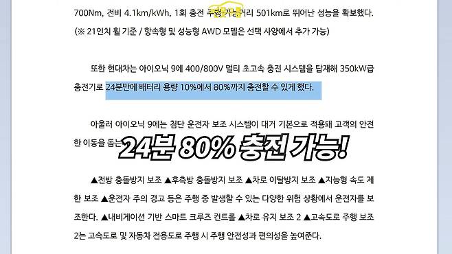 또한 24분 만에 10%에서 80%까지 급속 충전이 가능하며, 안전 사양 역시 뛰어나 프리미엄급 차량과 비교해도 손색없는 성능을 자랑한다.